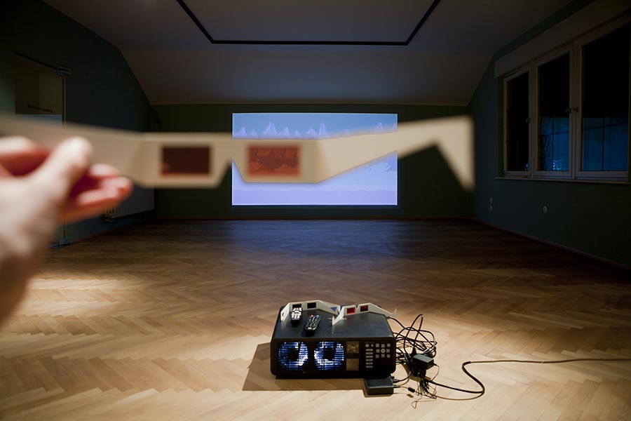 In Armin Wagners “Double 3D” werden die Rot-Grün Gläser zweier Anaglyphen-Brillen in zwei monochrome Paare zurück geführt, mit denen eine Videoprojektion auf zwei unterschiedliche Arten betrachtet werden kann. Die rote Brille zeigt eine mehrschichtige, vorbeiziehende Landschaft, die einem Videospiel (Moonpatrol, 1982) entnommen wurde. Die fernen Berge bewegen sich langsam von rechts nach links, der Vordergrund zieht rasch vorbei. Die grüne Brille zeigt das umgekehrtes Verhältnis: die Berge ziehen rasch vorbei, während sich der Vordergrund nur langsam vorbeizuschieben scheint.